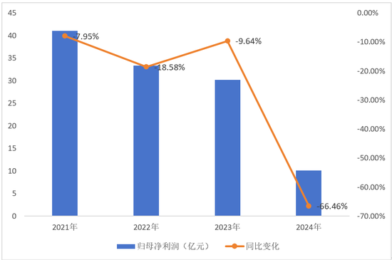 实际上,广州银行营业收入已连续两年下滑(2023年同比下降6.70%),归母净利润更是连续四年下滑(见下图)。评级机构中证鹏元在今年7月对该行出具的2025年跟踪评级报告中,也在关注事项中提到了该行盈利能力下滑,称是受市场竞争加剧、净息差收窄及贷款结构调整等因素影响。