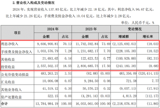 根据2024年年报,该行当年营业收入、归母净利润同比下滑速度均创近年之最,分别同比下滑13.86%、66.46%。该行营业收入的主要构成项,包括利息净收入、手续费及佣金净收入、投资收益均全面下滑,分别同比下滑18.03%、18.52%、8.68%。