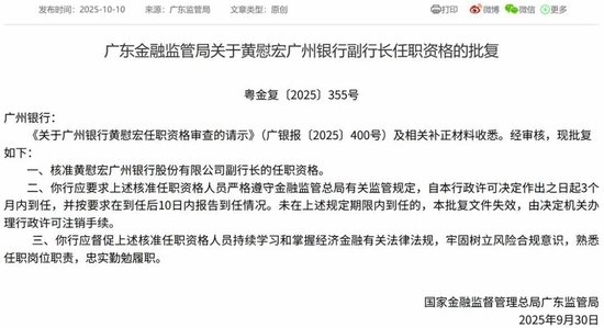 广州银行多家地方分行迎新行长。去年11月26日,白大为汕头分行行长的任职资格获核准;今年4月14日,陶文清韶关分行行长的任职资格获核准;5月19日,罗大志中山分行行长的任职资格获核准;5月25日,王争天横琴粤澳深度合作区分行行长的任职资格获核准;6月17日,王珏佛山分行行长的任职资格获核准;7月10日,邓凯峰江门分行行长的任职资格获核准;9月30日,林志贤肇庆分行行长、刘昉东莞分行行长的任职资格均获核准。广州银行2024年年报显示,截至当年末该行共在15个城市设有分行,换句话说,广州银行近半数分行行长于近期就任。