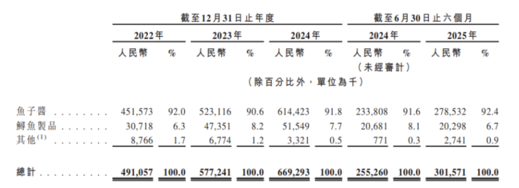 2022年至2025年上半年,公司90%以上的收入来自鱼子酱产品,鲟鱼制品、活鲟鱼销售及其他鱼子酱衍生品销售的收入占比很低。