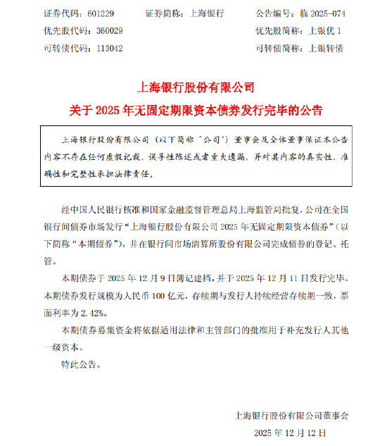 正文 上海银行:100亿元无固定期限资本债券发行完毕 亿通速配 V管理员 /2025-12-11 20:50:03/2阅读/0评论 1211 文章最后更新时间2025年12月11日,若文章内容或图片失效,请留言反馈! 12月11日金融一线消息,发布公告称,公司于2025年12月11日完成了2025年无固定期限资本债券的发行。 本期债券的发行规模为100亿元,票面利率为2.42%。本期债券的存续期与公司的持续经营存续期一致,募集资金将用于补充公司的其他一级资本。 本期债券的发行经过中国人民银行的核准以及国家金融监督管理总局上海监管局的批复,并在银行间市场清算所股份有限公司完成了登记和托管。