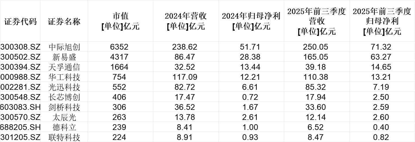 中际旭创2025年前三季度营收、净利分别达250.05亿元、71.32亿元。、等企业2025年前三季度营收普遍在30-110亿元区间;而部分中小规模企业,2025年前三季度净利多在3亿元以下,尾部企业的盈利空间持续被压缩。