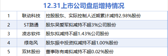 正文 12月31日增减持汇总:立讯精密等4股增持 联动科技等5股减持(表) 亿通速配 V管理员 /2025-12-31 22:25:06/1阅读/0评论 1231 文章最后更新时间2025年12月31日,若文章内容或图片失效,请留言反馈! 炒股就看,权威,专业,及时,全面,助您挖掘潜力主题机会! 据统计,12月31日,盘后、、、披露增持情况。包括、、、、在内的5家A股上市公司披露减持情况。