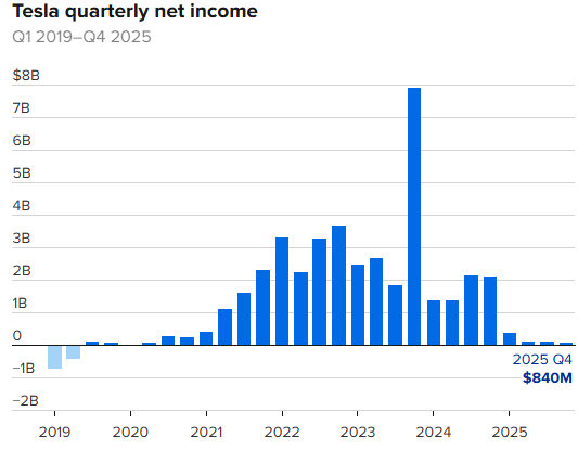 受运营成本同比激增 39% 影响,特斯拉四季度净利润同比暴跌 61%,从去年同期的 21 亿美元(合每股 0.60 美元)降至 8.4 亿美元(合每股 0.24 美元)。