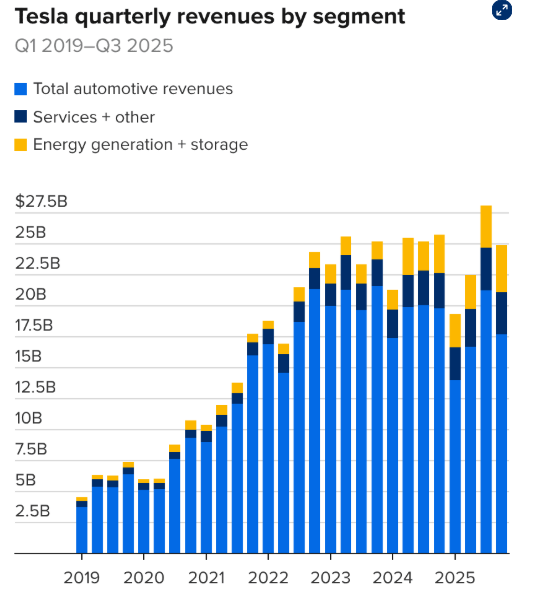 特斯拉四季度营收从去年同期的 257 亿美元同比下滑 3%,其中汽车业务营收大跌 11%。公司在财报中披露,2025 年全年营收从 2024 年的 977 亿美元降至 948 亿美元。特斯拉表示,营收下滑的部分原因是 “汽车交付量减少” 以及 “监管积分收入下降”。