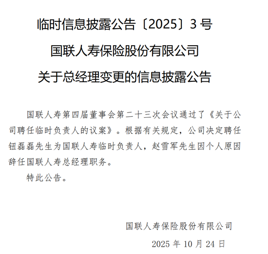 10月24日,国联人寿发布一则临时信息披露公告。公告显示,公司决定聘任钮磊磊为国联人寿临时负责人,赵雪军因个人原因辞任国联人寿总经理职务。