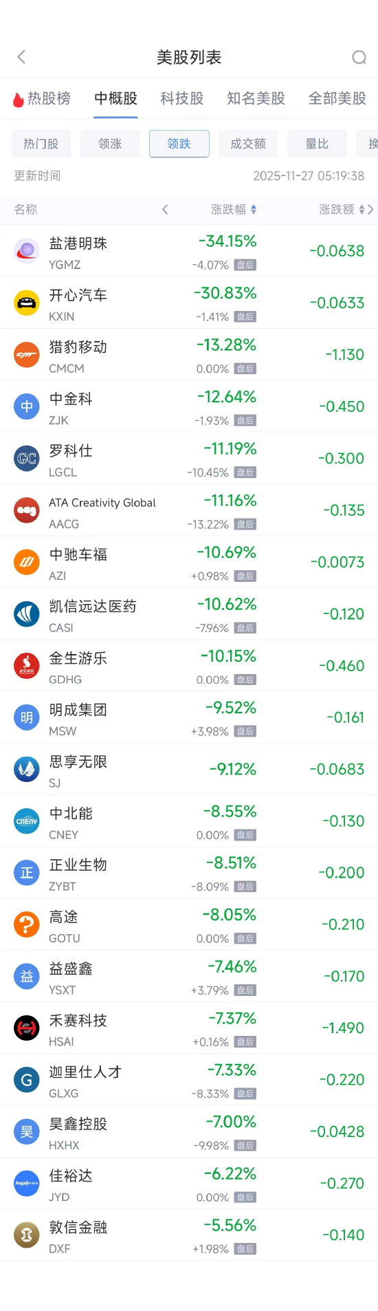 11月27日热门中概股涨跌不一,中国金龙指数(HXC)收跌0.03%。