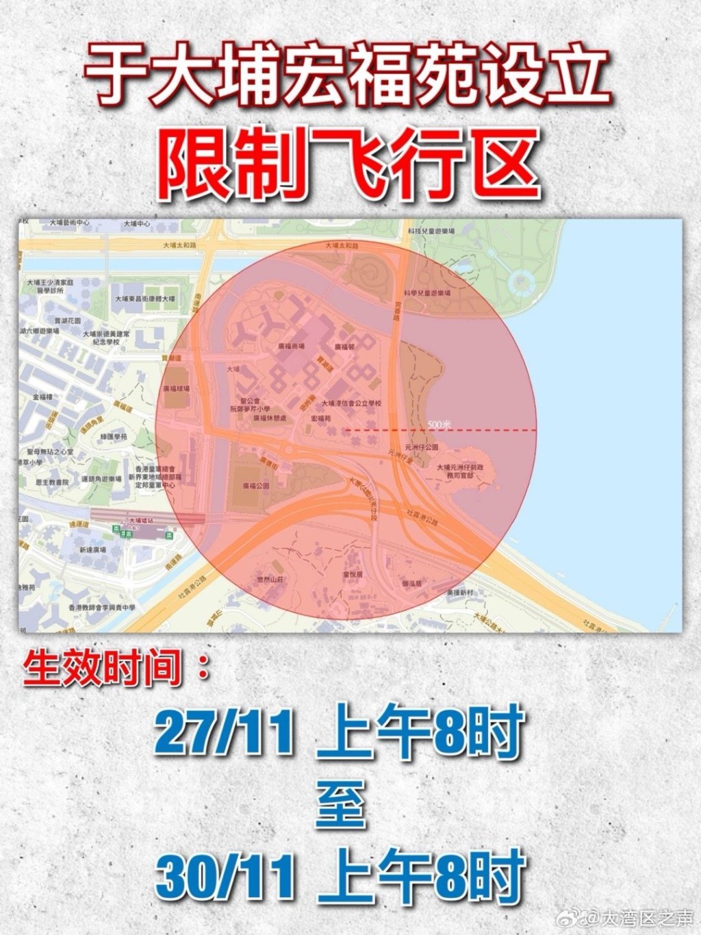 正文 香港警务处于大埔宏福苑设立限制飞行区 亿通速配 V管理员 /2025-11-27 06:25:03/1阅读/0评论 1127 文章最后更新时间2025年11月27日,若文章内容或图片失效,请留言反馈! 就香港大埔宏福苑发生的五级火警,为保障公众安全及确保救援工作进行,香港警务处将于该范围设立“限制飞行区”。时间为2025年11月27日上午8时至2025年11月30日上午8时。