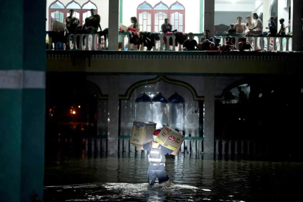 11月29日,在印度尼西亚北苏门答腊省的棉兰,救援人员涉水运送物资。