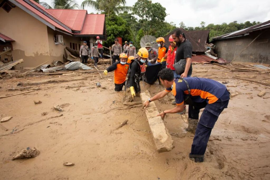 12月1日,在印度尼西亚西苏门答腊省,救援人员运送遇难者遗体。