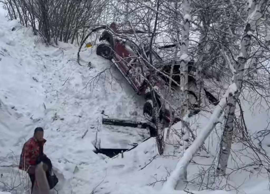 滑到路下方谷底侧翻的越野车。